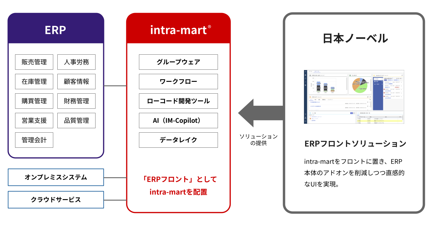日本ノーベルは、1999年から培ってきたintra-martの導入実績と、自社製品「EPCUSシリーズ」の開発で得た知見を活かし、ERPの操作性向上と業務の柔軟性を両立するフロントソリューションを構築しました。また、開発スピードの向上とコスト削減を求めるニーズに応え、ローコード開発ツールを駆使した「内製化」を支援する新たな体制を整えました。