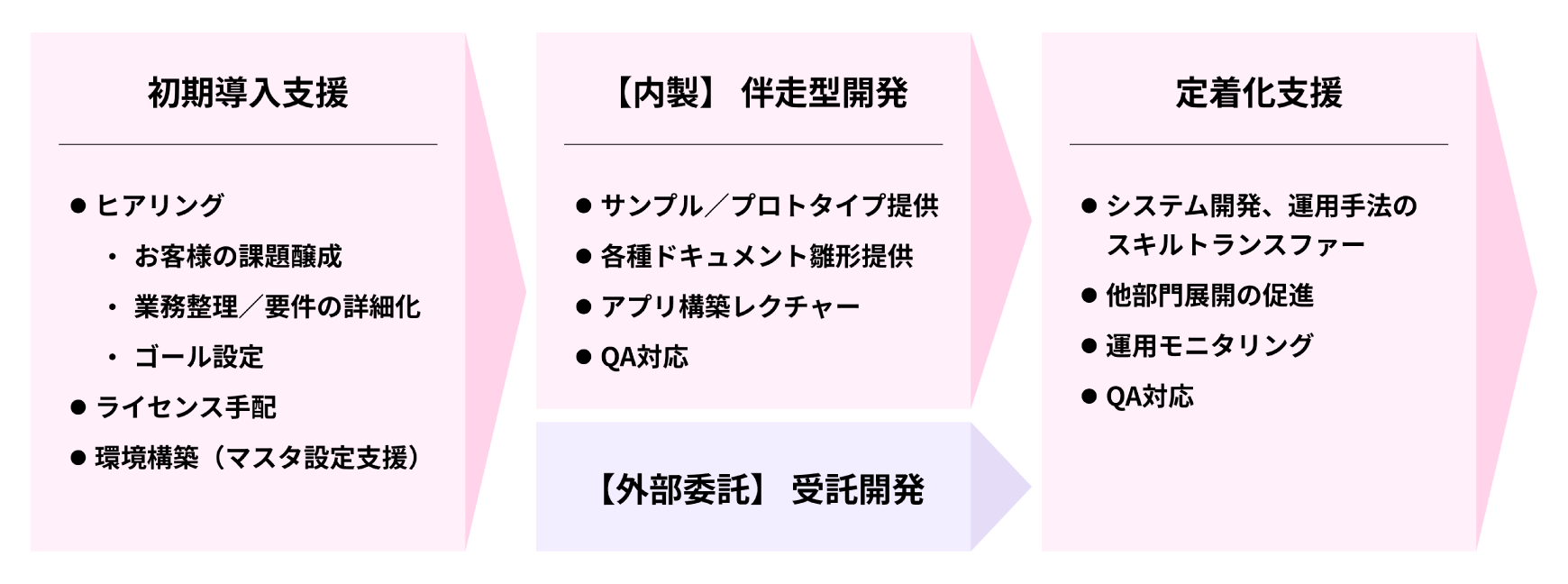お客様が自らシステムの開発・運用を行えるよう、技術支援を行います。