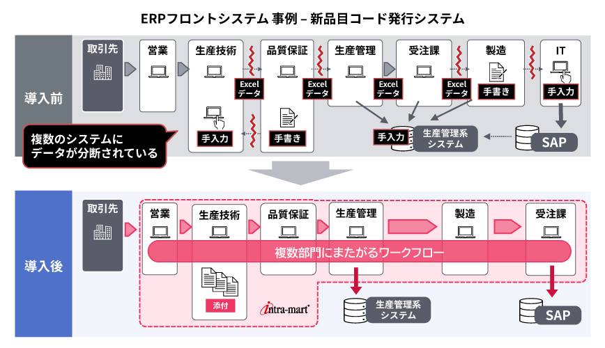 濵渦氏: 特に「新品目コード発行(NMI※1)」のプロセスが深刻でした。新製品をシステムに登録し、受注・出荷を可能にするには、品質管理や法規制対応など複数部門との調整や承認が必要です。この重要な工程がアナログ運用だったため、完了まで平均7〜8営業日を要していました。手作業によるミスの防止と進捗の可視化、そして、ERPの堅牢さを生かしつつ、現場の柔軟性を補完する仕組みの構築が、製造DXを加速させるための命題でした。